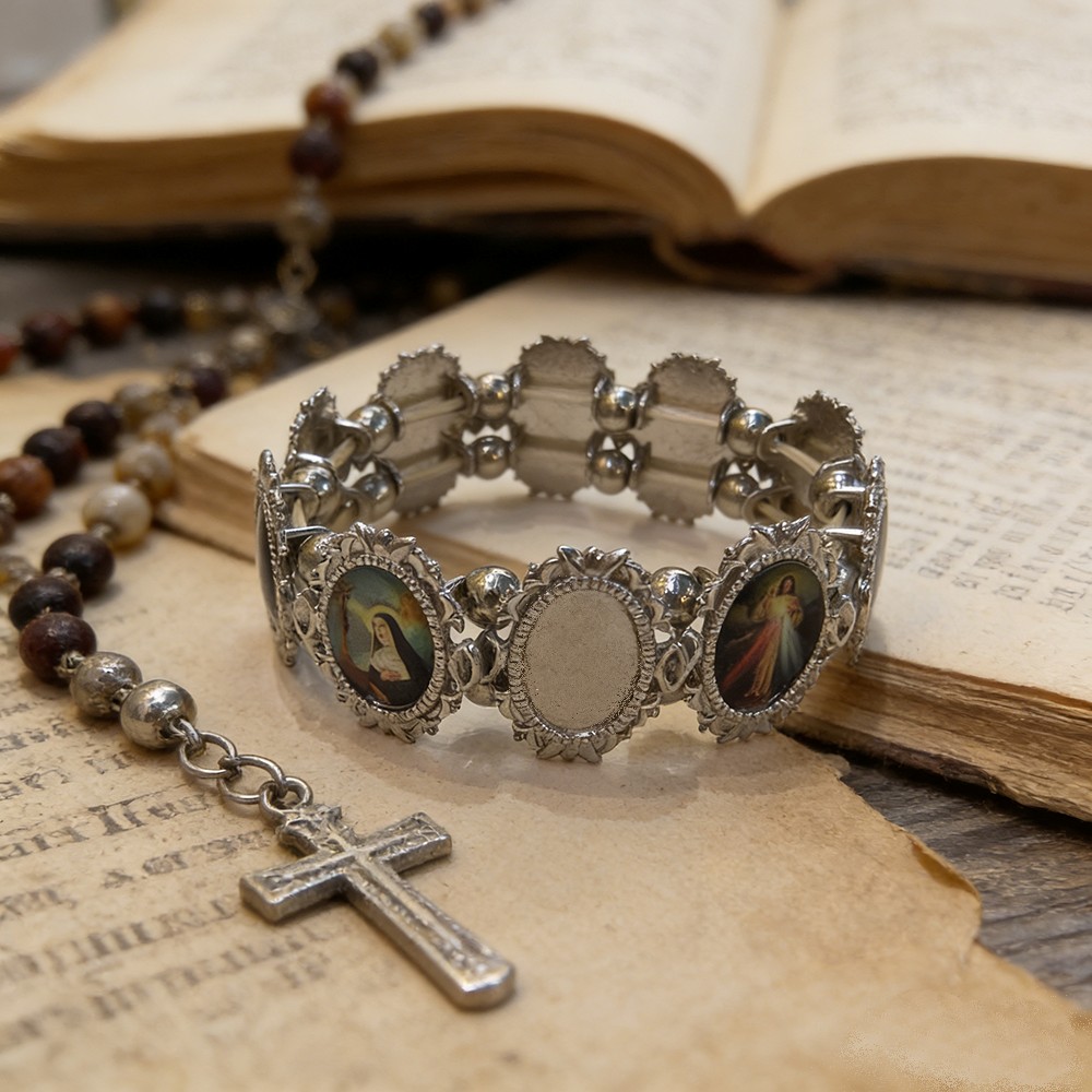 银色)金属手环饰品手链金色合金串珠贴图人像手饰弹力手环