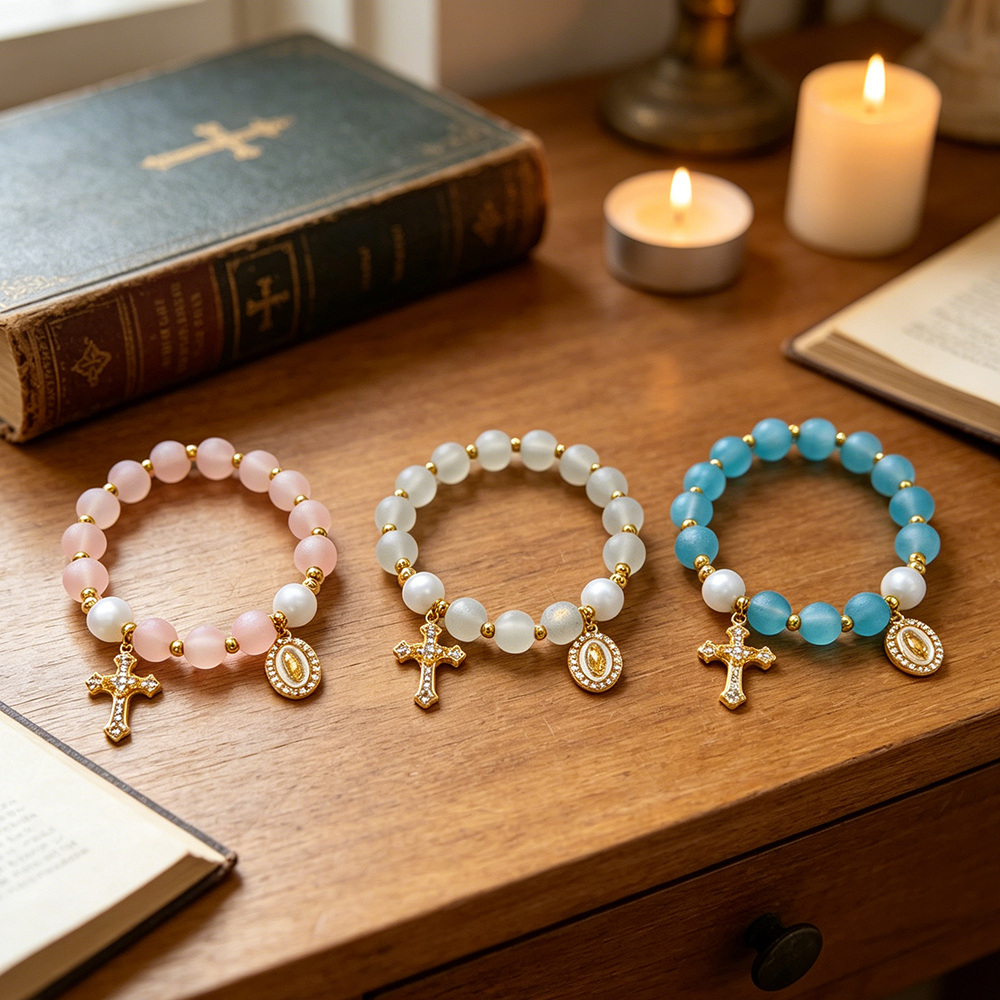 (白色)磨砂珠玫瑰经念珠手链 镀金镶钻爱心十字架饰品 洗礼礼物