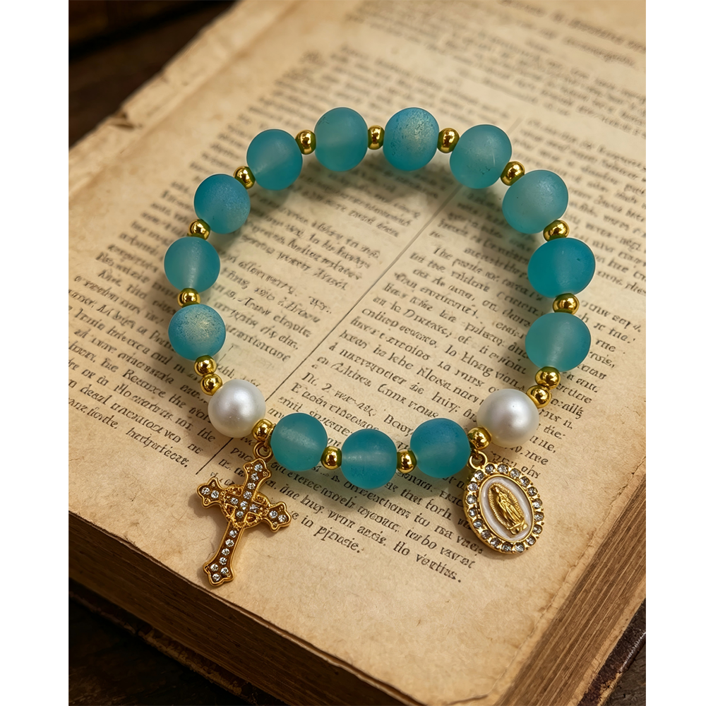 (蓝色)磨砂珠玫瑰经念珠手链 镀金镶钻爱心十字架饰品 洗礼礼物
