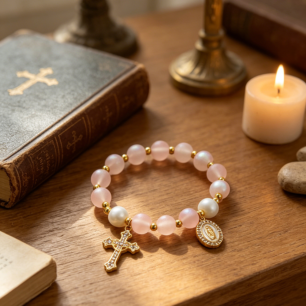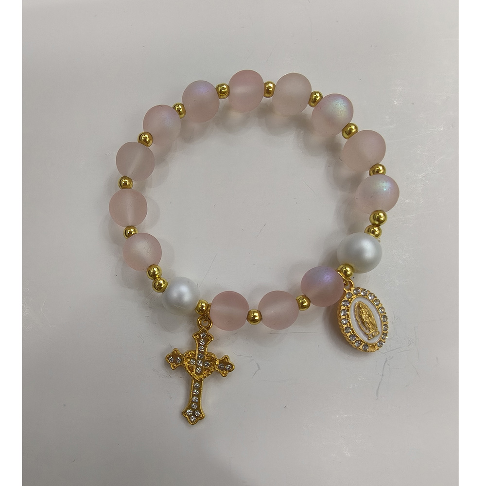 (粉色)磨砂珠玫瑰经念珠手链 镀金镶钻爱心十字架饰品 洗礼礼物