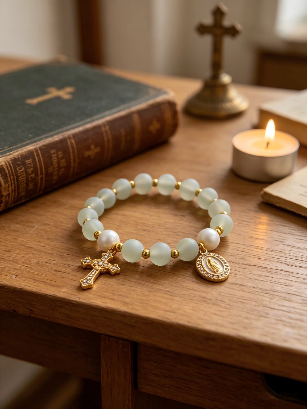 (白色)磨砂珠玫瑰经念珠手链 镀金镶钻爱心十字架饰品 洗礼礼物