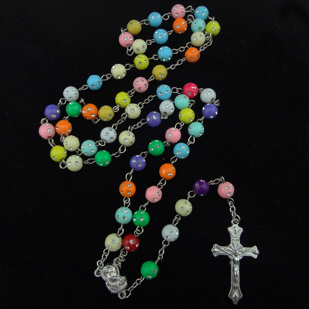 外贸货源批发手工念珠项链十字架 树脂混色彩虹项链20.2g