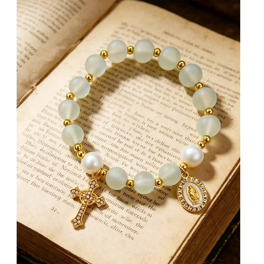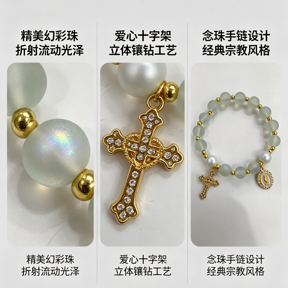 (白色)磨砂珠玫瑰经念珠手链 镀金镶钻爱心十字架饰品 洗礼礼物